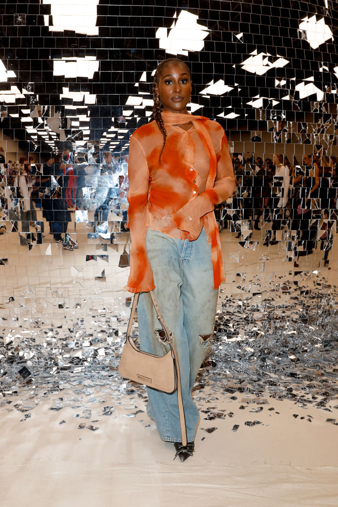 Our President Barbie Issa Rae is giving carefree Black girl at the Acne Studios Ready To Wear show. Her baggy, distressed jeans and sheer print shirt are so in trend right now.