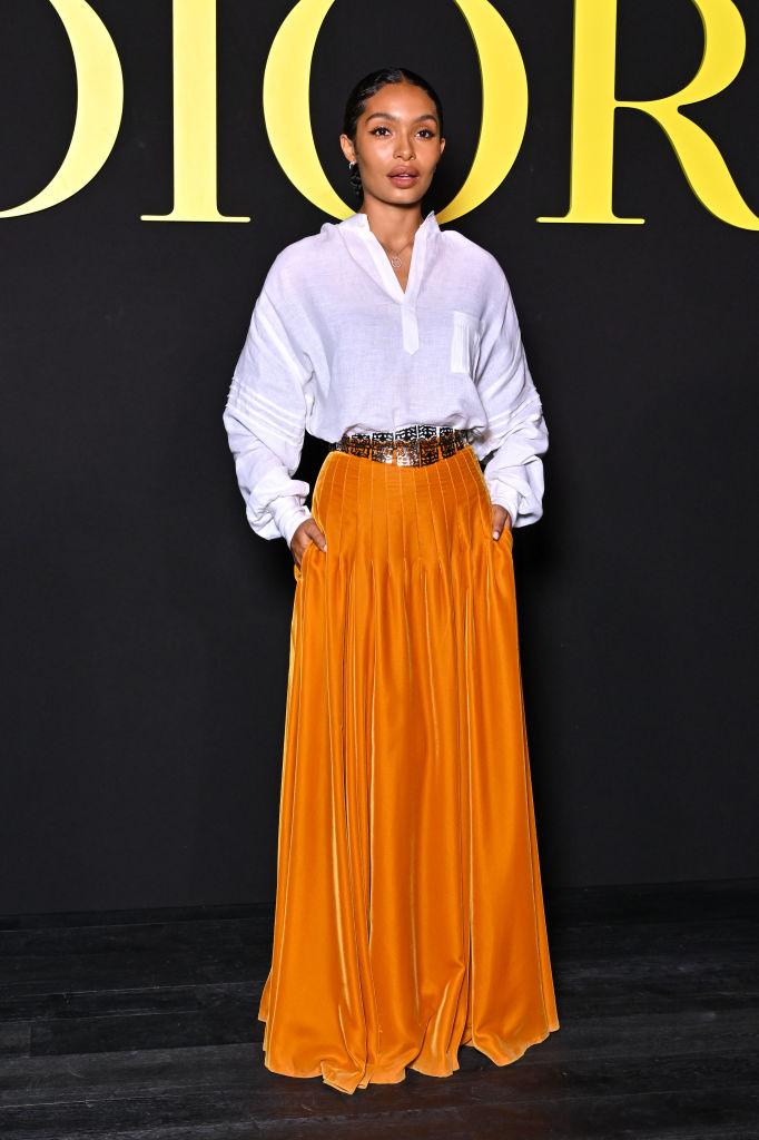 We are loving Yara Shahidi’s look for the Christian Dior PFW show. Her white button-down blouse pairs perfectly with her pleated skirt in a rich orange color. Who else is thinking pumpkin-spice style?